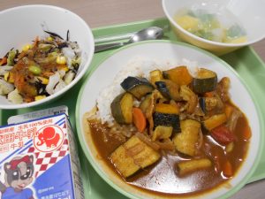 今日の給食は夏野菜カレーでした。ズッキーニにかぼちゃに茄子、トマト等・・・たくさんの野菜が入ったとてもおいしいカレーでした。みんな完食でした。給食室の調理員の皆様,いつも本当にありがとうございます。このことも明日ありがとうの木に花が咲いてほしいです。